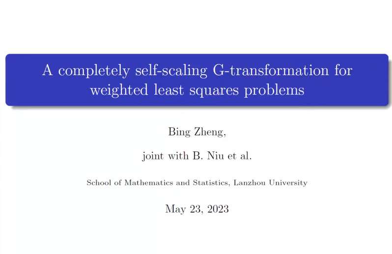 2023年5月23日下午兰州大学郑兵教授通过腾讯会议线上为我院师生主讲了题为“A completely self-scaling G-transformation for weighted least square problems”的学术报告. 报告会由左可正教授主持, 基础数学和计算数学的老师及其研究生共同在10803教室聆听.