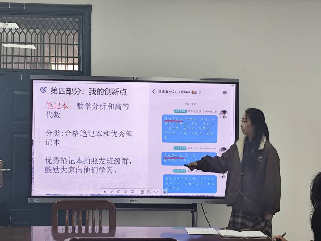 会上,屈媛媛全面复盘本学期班导工作。她指出,本学期14名班导各组织三十余次晚自习活动,在工作推进与学风建设上成效显著,学生满意度较高。同时,她明确后续工作要求:班导开展班级管理需秉持“刚柔并济”原则,同时要聚焦不同年级的工作重点,以分层分类的精准施策,助力学生成长进步。随后,研一学科数学于淑淼从核心目标与底层逻辑、日常管理重点、个人创新点及未来规划分享了工作经验,其分享既有理论层面的深度思考,又有实践层面的鲜活案例,为全体班导提供了可复制、可借鉴的工作范式。
